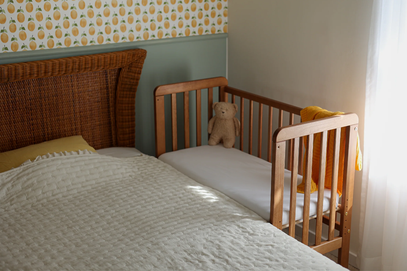 - Woodies Co‑Sleeper aus Holz - eine Seite lässt sich entfernen, um das Beistellbett sicher am Elternbett zu befestigen, oder nutzen Sie es freistehend; optionale Rollen erleichtern das Verschieben in Ihrem Zuhause.