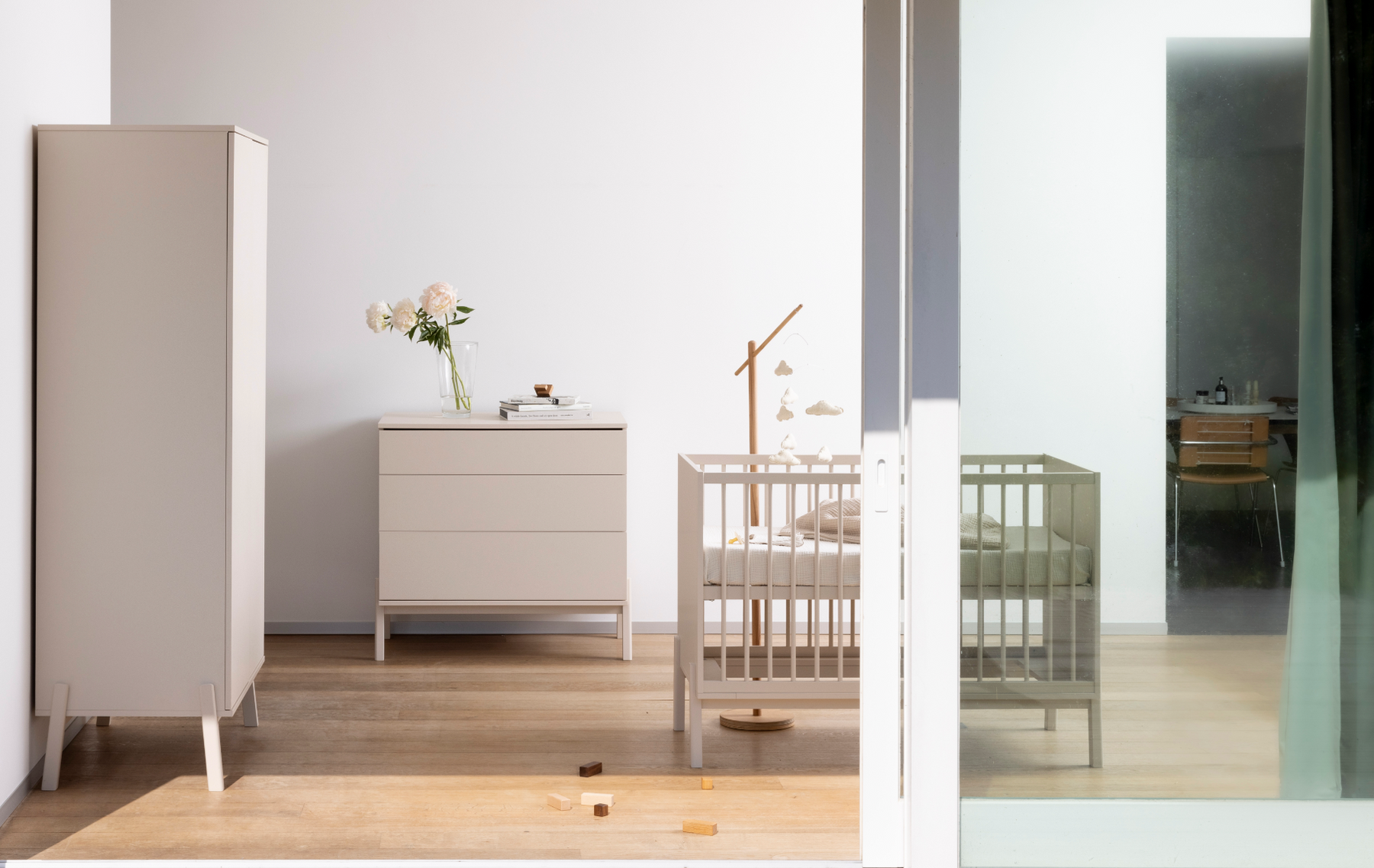- Rent, monokromt design, der smelter sammen med moderne babyværelsesmøbler.