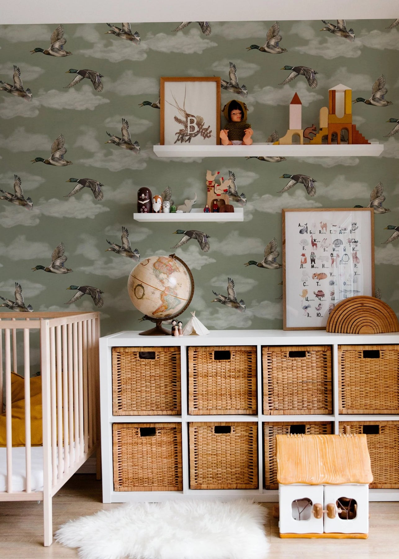 Skab en beroligende, naturinspireret stemning på dine vægge med gråand, der svæver gennem bløde skyer - et kunstnerisk illustreret design, der tilføjer bevægelse og ro til ethvert rum, tilgængeligt i fire elegante farvevarianter.