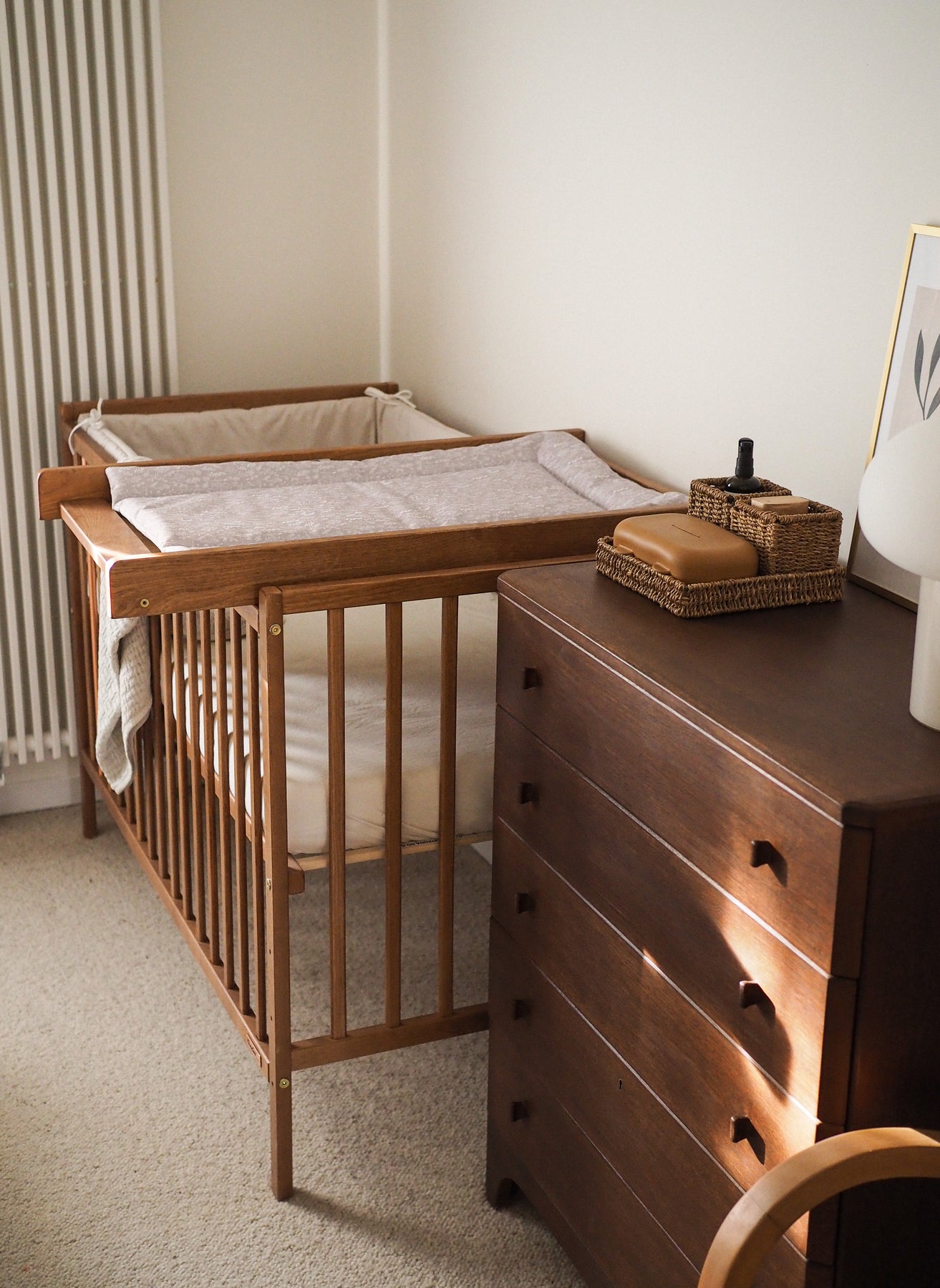 Optionele toevoeging: Vintage opzetcommode met verschoonmatje — bespaar vloerruimte.