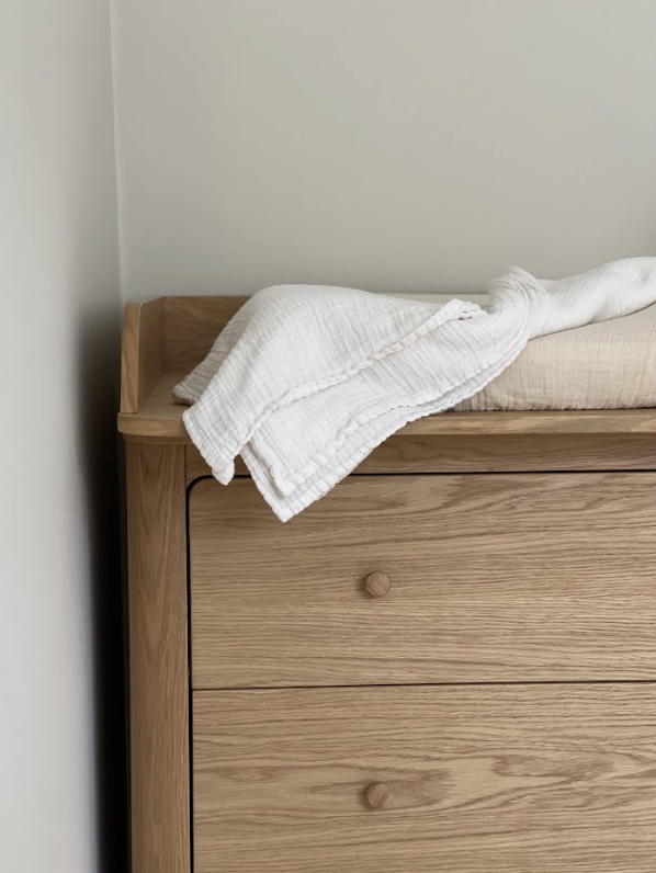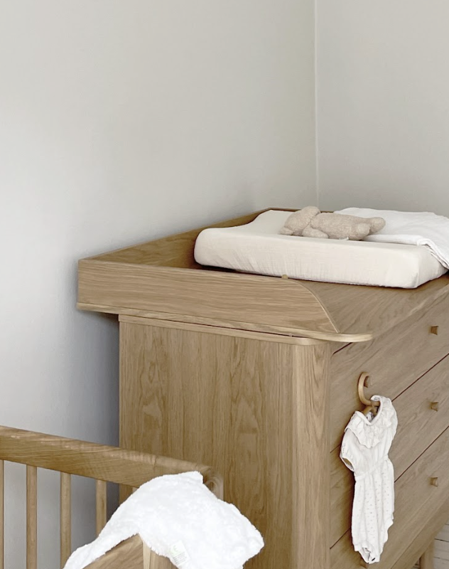 Von den ersten Tagen bis zum Alltag schafft dieser Wickelaufsatz Ruhe in den geschäftigsten Momenten. Die feine Eichenoberfläche ergänzt modernes Kinderzimmermobiliar und schafft ein harmonisches Gesamtbild, während Wickelutensilien griffbereit bleiben.